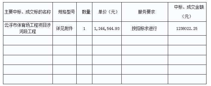 云浮市億鑫招標采購代理有限公司受云浮市體育局的委托,于2019年01月30日就云浮市體育場工程項目涉河段工程(445300-201901-408001-0002)采用競爭性磋商進行采購?,F(xiàn)就本次采購的中標(成交)結(jié)果公告如下: